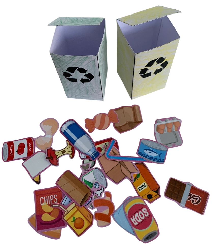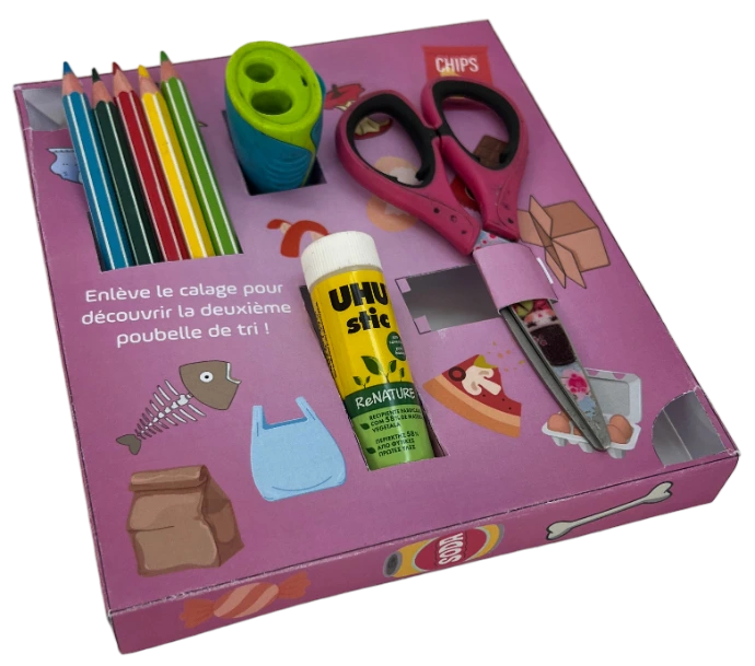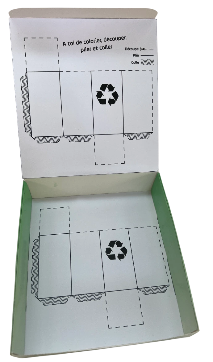Nous avons choisi de concevoir une boîte qui, une fois ouverte, peut être découpée pour former de petites poubelles que l’enfant peut colorier, plier et coller. Le calage intérieur, quant à lui, intègre des illustrations de déchets que l’enfant peut également découper.