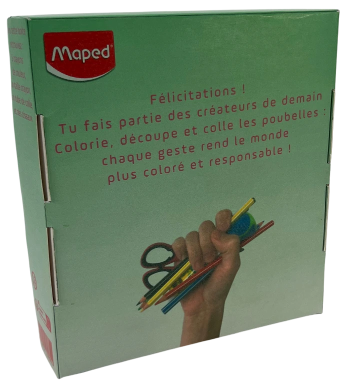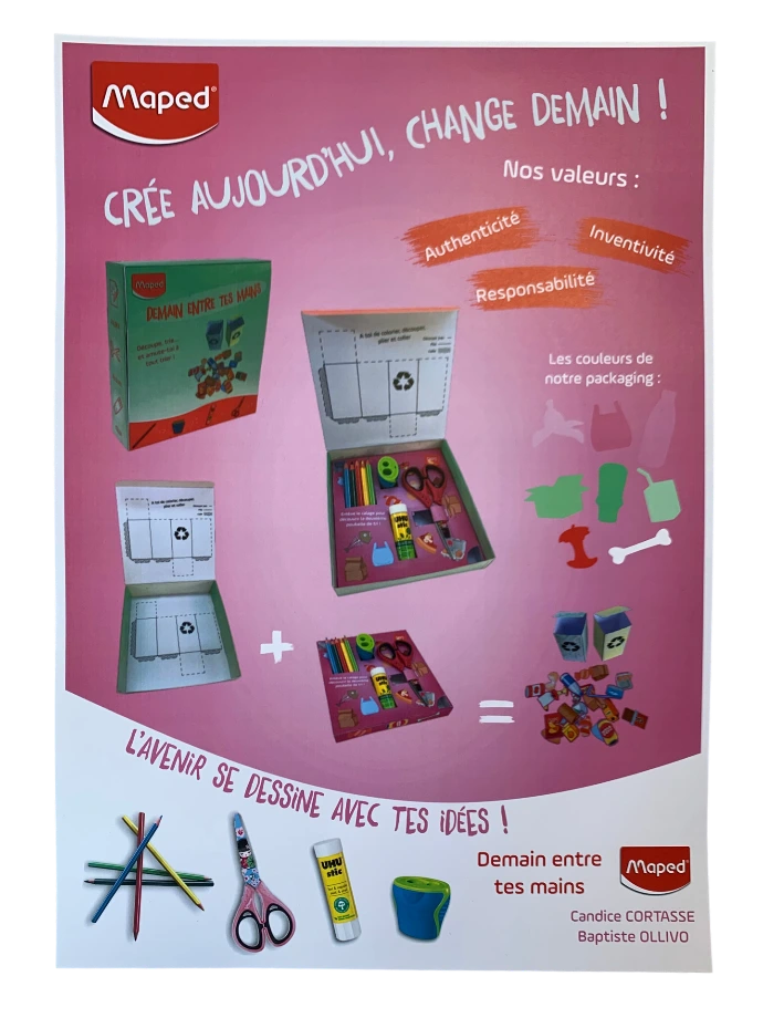 Le projet consistait à réaliser une boîte pour des produits Maped, destinée à être offerte dans le cadre du concours fictif « Demain entre tes mains ». L’emballage devait être réutilisable tout en respectant le slogan de la campagne.